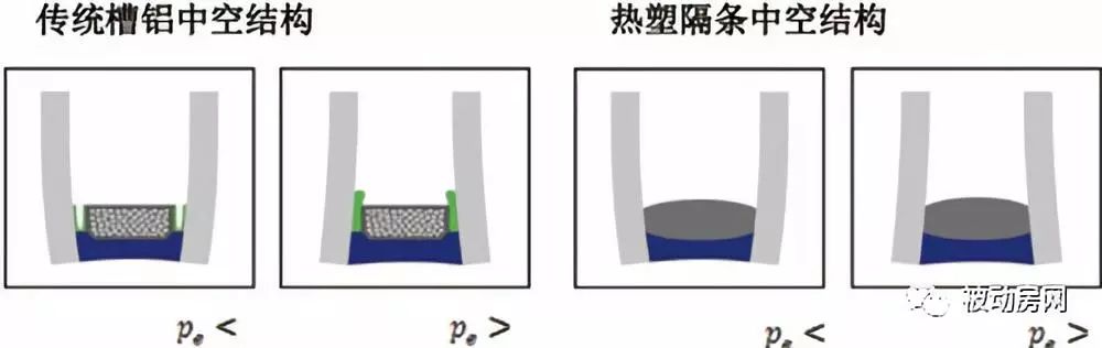 图9 传统槽铝式中空玻璃与热塑隔条(TPS)系使用中的变化示意