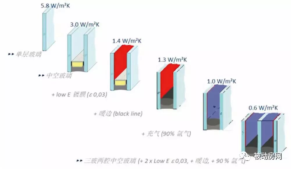 中空玻璃由于优越的节能性能,在建筑中得到了越来越广泛的应用。同时,随着建筑节能标准的逐步提高以及被动式建筑的推广应用,对中空玻璃节能特性的要求也逐步提高,Low-E玻璃的广泛使用,中空玻璃中充入氩气、氪气等惰性气体来改善隔热性能的产品也在逐年增加,这些中空玻璃配置的提升造成生产制造成本也在不断增加。图1给出了从单片玻璃到三玻两腔的各类典型配置和对应的传热系数K值。