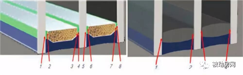 对于全新节能建筑概念的被动房玻璃普遍使用的三玻两腔中空玻璃来说(如图10),由于其两侧的玻璃会受到另一个腔的作用而产生更大的应力,从而导致丁基胶的变形、降低第一道密封的作用、增加水汽的通道,使中空玻璃更快地失效,热塑隔条的密封优势会体现得更明显。