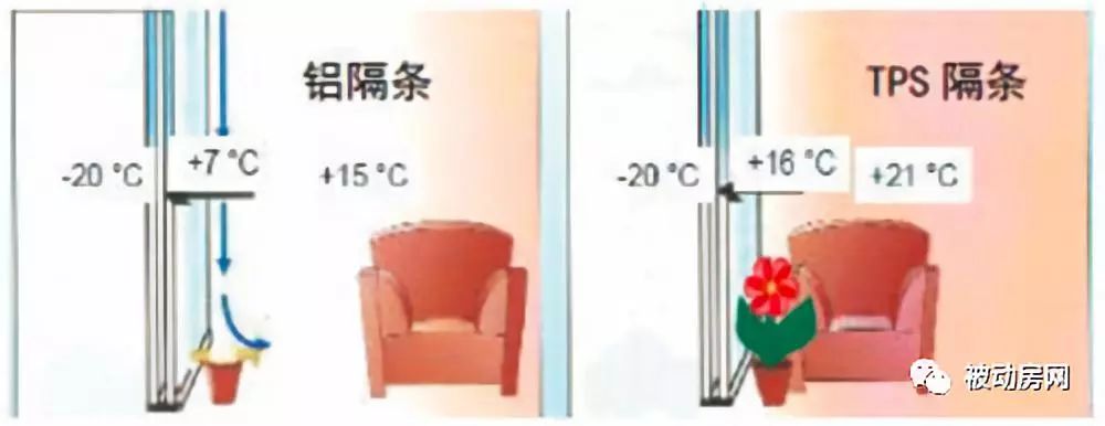 随着人们生活质量的提高,对居住环境的舒适性要求也越来越高,热塑隔条(TPS)密封系统带来的暖边效应有利于稳定室内温度,降低空气对流,能提供更加舒适的室内环境。由于暖边系统的存在,也会降低窗玻璃边缘水雾的凝聚,同时也降低了窗框的维护费用(如图4、图5)。